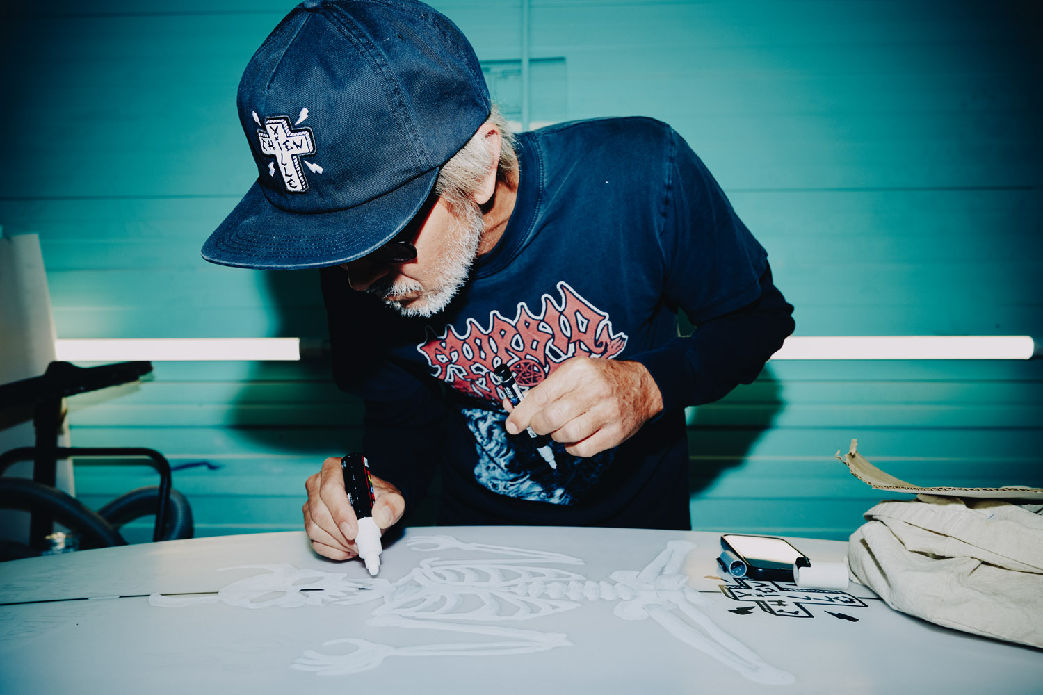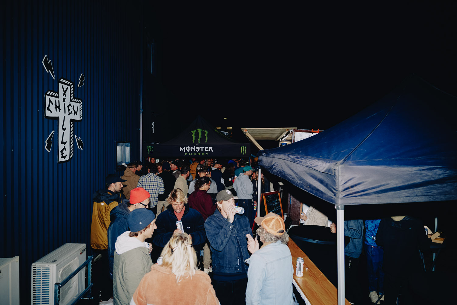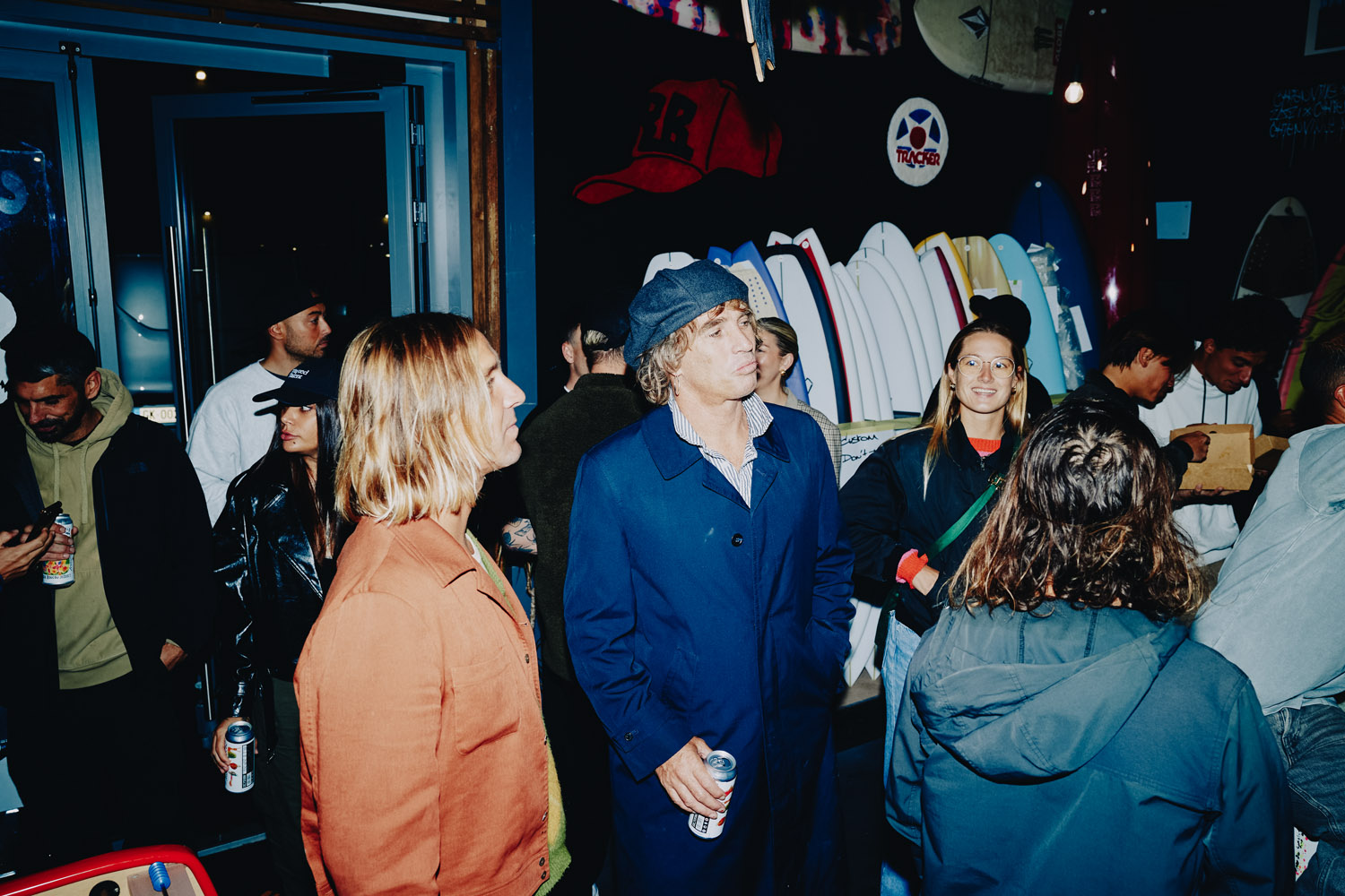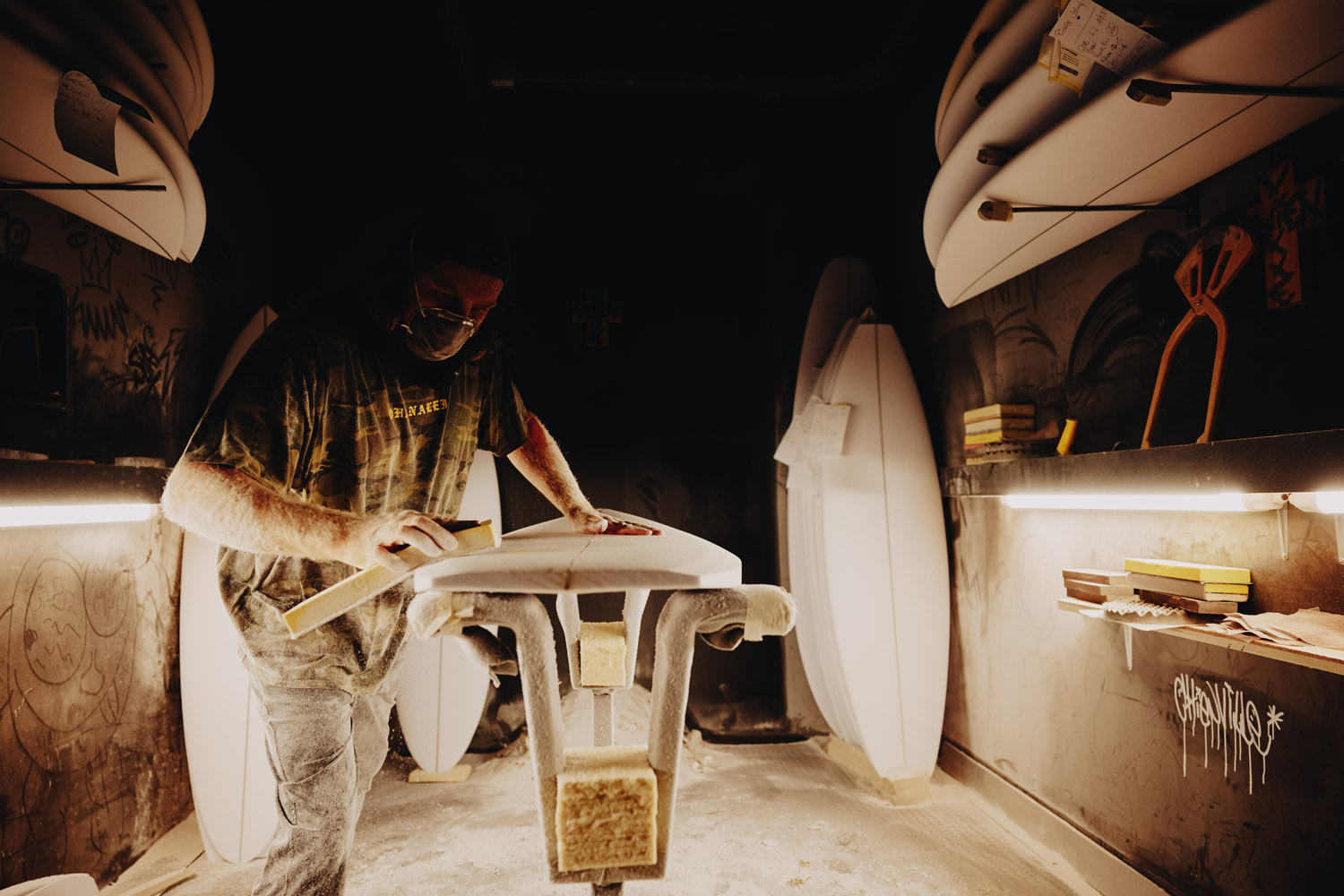 Pentagram Pizza painting live and Ryan Lovelace shaping boards on-site. Locals, groms, pros and surf industry personalities all packed into the space; paint flying, resin dripping, and music echoing into the french night.
